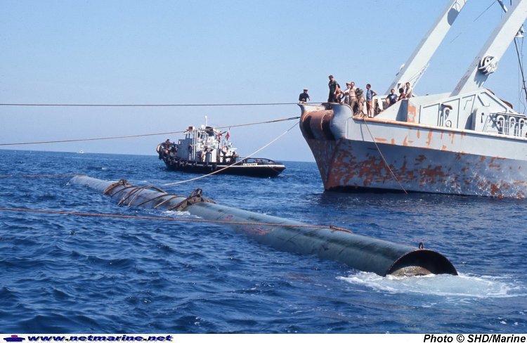 travaillent à la mise en place de l'antenne Berthe devant le Cap ferrat (1970).