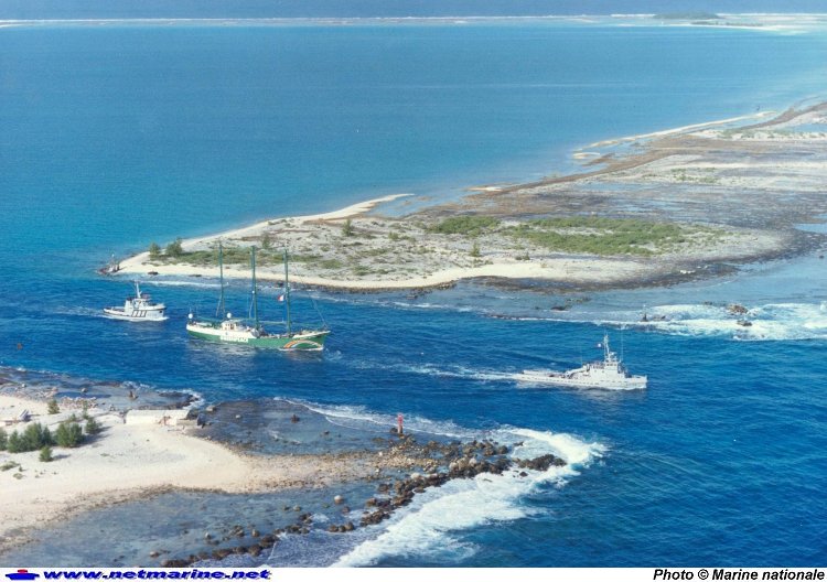 remorque le navire Greenpeace, après saisie, dans le lagon de Mururoa. Le remorqueur