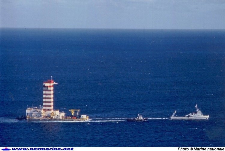 et un remorqueur portuaire de 700 CV tractent la barge de forage ManuCEA. Cette barge est chargée de mettre en place le conteneur d'expérimentation dans le trou préalablement foré (date inconnue).