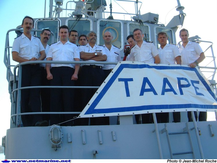 Autour de son commandant, le lieutenant de vaisseau Floart, l'équipage du remorqueur ravitailleur