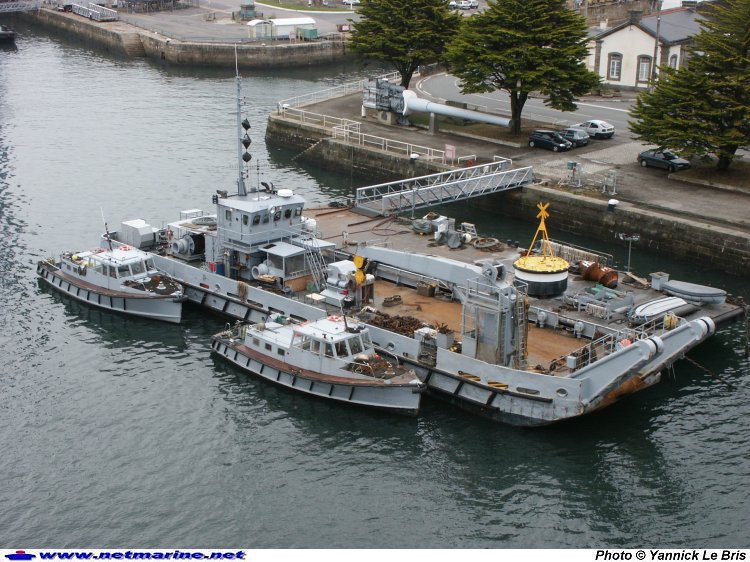 Telenn Mor amarré au poste 3 dans la Penfeld. A couple, les chaloupes Telgruc et Pastenague servant au soutien des plongeurs. Sur le ponton, la balise jaune destinée à marquer une zone interdite (18 mai 2003).