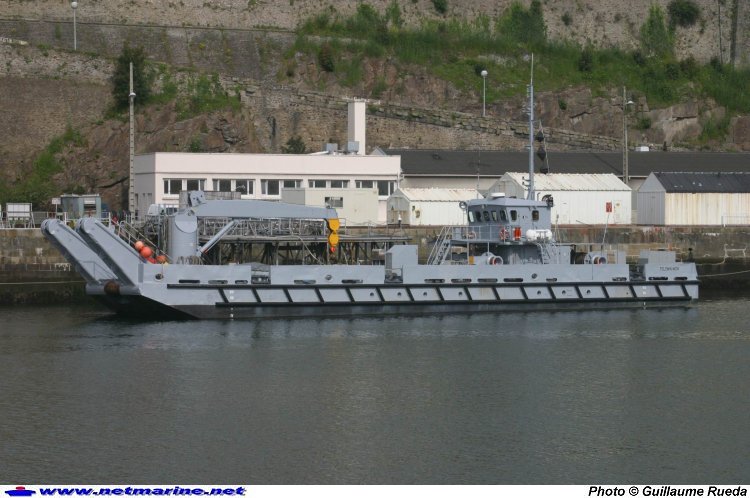 à quai dans la Penfeld. La propreté de sa coque indique qu'il vient dêtre caréné (14 juillet 2002).