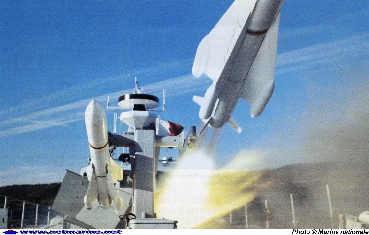 Tir d'essai à bord de Tourmaline d'un missile MM15 au profit de la société Aérospatiale devenue EADS. A l'occasion de cette campagne de tir, une rampe de lancement double est implantée plage avant et un radar de tir Agrion monté sur le toit de l'abri de navigation (1994).