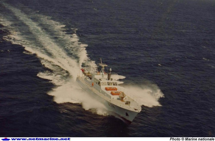 à pleine vitesse au large des Salins d'Hyères. On peut remarquer la taille importante des mires radar implantées plages avant et arrière (1979 - remerciement Christian de Vita).