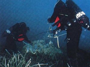 | Des plongeurs démineurs en action (par le SM plongeur-démineur Dupont - d'après Armées d'aujourd'hui n°233, septembre 1998 ; photos Marine nationale)