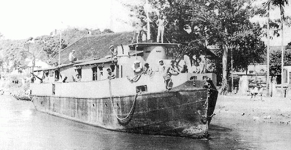 | Les chalands cuirassés Il s'agit probablement là du plus bel exemple de ce que put réaliser l'esprit inventif du commandant Jaubert et de son équipe. A partir de vieux chalands automoteurs destinés au transport du riz paddy entre le Transbassac et Saïgon, grande bailles en fer ; qui ne sont rien d'autre que de grandes cales avec un moteur à l'arrière (et quel moteur ! ), cette équipe réussit à faire naître des engins de guerre, toujours très inesthétiques mais puissamment armés, et capables de transporter chacun une compagnie. Ces chalands appartiennent initialement à la famille Gressier, dont la "ferme" est située à une trentaine de kilomètres au sud-ouest de Cantho, sur le canal Xa-No ; on utilise donc souvent la dénomination de "chalands Gressier" pour ces bateaux.