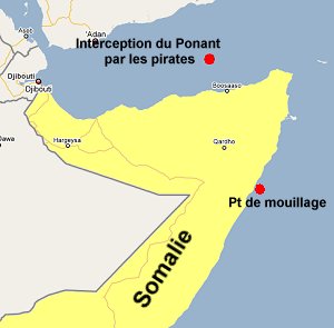 Le trois-mâts Ponant, voilier de la Compagnie des Iles du Ponant (CIP), filiale de la CMA CGM, quitte le 28 mars Les Seychelles pour rejoindre la Méditerranée et Alexandrie (Egypte), sa prochaine escale. Construit en 1991, le Ponant navire à 4 ponts qui mesure 88 mètres de long, peut transporter 64 passagers pour des croisières de luxe. Pour ce trajet, il n'y a pas de touristes à bord, mais seuls 30 membres d'équipages assurent le convoyage du navire et sa préparation pour une future croisière qu'il doit réaliser du 21 au 22 avril entre Alexandrie et La Valette (Malte). 4 avril : Lances à incendie contre Kalachnikov Le 4 avril à 11h15, alors que le Ponant navigue au milieu golfe d'Aden, dans les eaux internationales entre la Somalie et le Yémen, il est abordé à plusieurs dizaines de kilomètres des côtes, par deux embarcations contenant une douzaine de pirates somaliens. L'équipage du Ponant tente de les repousser avec des lances à incendie, mais c'est peine perdu contre ces brigands, armés de fusils d’assaut AK-47 et de lance-roquettes RPG-7, qui prennent d'assaut le navire. L'équipage du Ponant (vingt-deux français dont six femmes, six philippins, une ukrainienne et un camerounais) est fait prisonnier. Son capitaine, Patrick Marchesseau, a juste le temps de lancer un appel de détresse grâce au système automatique installé en passerelle.