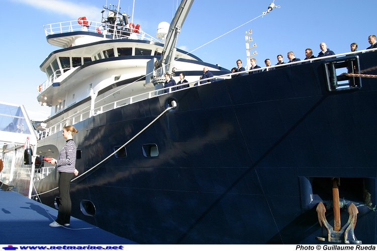 La bouteille de champagne est prète a être lancée sur la coque de l'Abeille Liberté (17 novembre 2005).