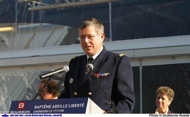 Le préfet maritime de la Manche et de la mer du Nord, Edouard Guillaud lors du baptême de l'Abeille Liberté (17 novembre 2005).