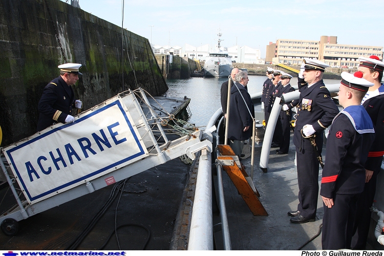 Le commandant de la base navale de Cherbourg le CV Jean Philippe Anckaert monte à bord du remorqueur côtier Acharné (15 mars 2011)