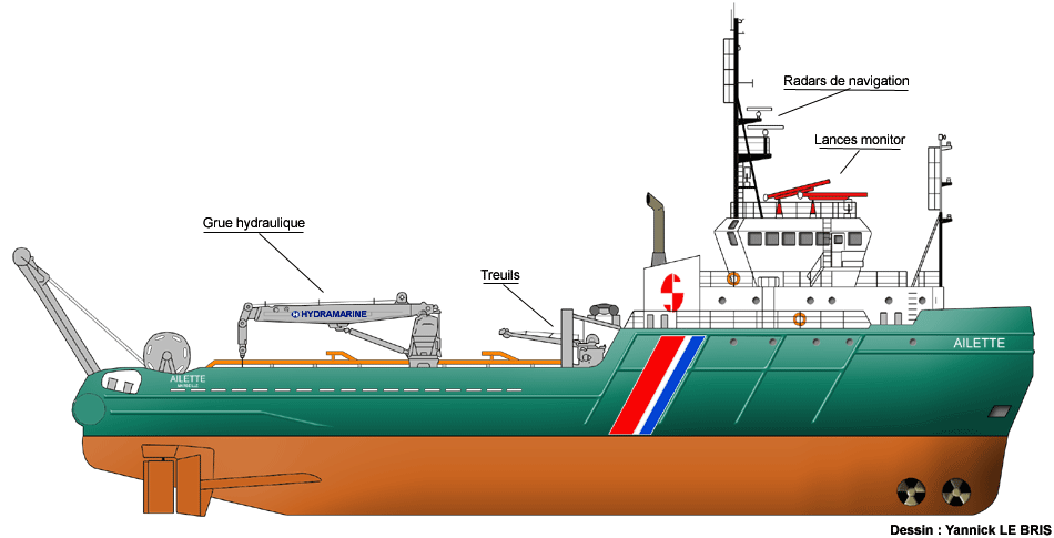 de 12 m qui, lors des interventions, se déploie en biais le long du navire.