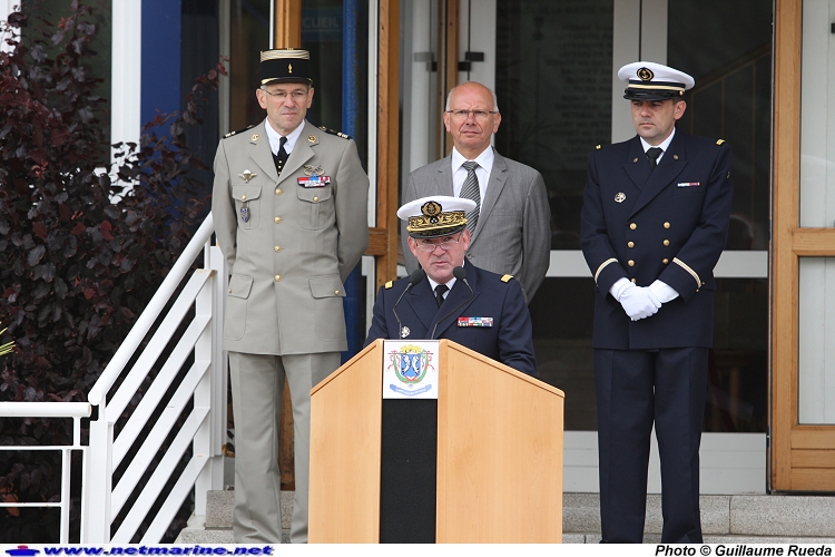 Le Préfèt maritime de la Manche et de la mer du Nord le vice amiral Bruno Nielly, le Délégué Militaire Départementale le colonel Potez, le maire de Saint Valery en Caux Gérard Mauger et le commandant du PSS Coralline à l'occasion des 20 ans du parrainage du batiment avec la ville de Saint Valery en Caux. (25 Juin 2011)