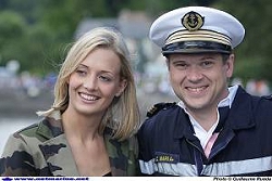 bord pour la plus grande joie du commandant et de son équipage. L'équipage retiendra de ce séjour à Rouen, la ferveur populaire, la fête tous les soirs, le regard des jeunes filles et les rencontres avec des marins du monde entier. (En photo : Marion, jeune mannequin rouennaise au coté du commandant du Flamant) 13