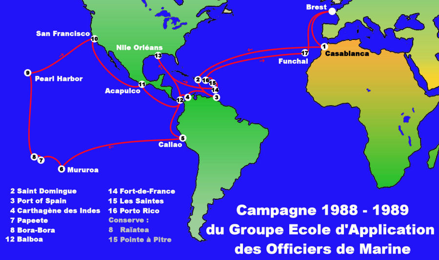 Itinéraire de la 25ème campagne d'application du porte-hélicoptères Jeanne d'Arc accompagné l'aviso-escorteur Commandant Bourdais