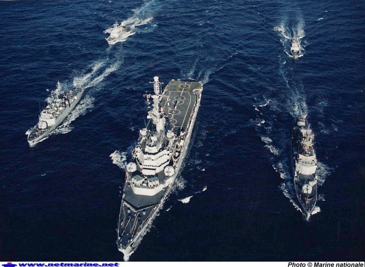 Le porte-hélicoptères Jeanne d'Arc, accompagné de l'aviso Lieutenant de vaisseau Lavallée. A droite l'aviso escorteur EV Henry, au fond 2 patrouilleurs type P400 basés à Papeete (campagne 1990/91).