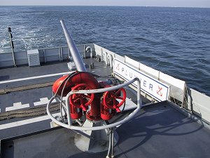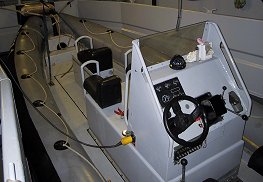 Un radier à l'arrière permet la pour une embarcation type Hurricane (longueur : 6,70 m ; propulsion : water jet ; puissance : 200 CV ; vitesse max. : 30 nds), ce qui permet sa mise en oeuvre pendant que le bâtiment fait route à faible vitesse.