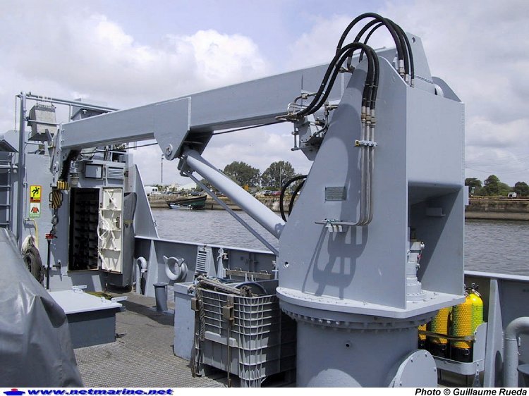La grue hydraulique, sur la plage arrière des bâtiments bases de plongeurs démineurs (BBPD), permet de mettre rapidement à l'eau ses zodiacs pour intervenir (5 tonnes à 6 m ou 3.5 tonnes à 10 m) (