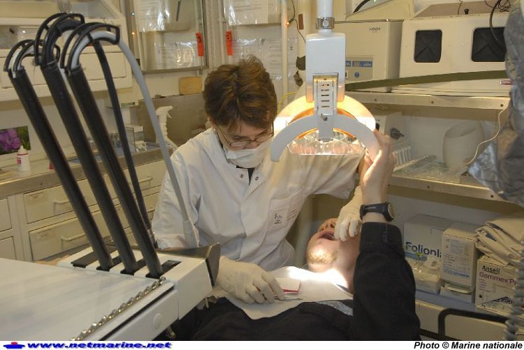 Intervention de la dentiste Magalie Brochard à bord du porte-hélicoptères Jeanne d'Arc (4 janvier 2008 photo Marine nationale -maître principal Le Ny )