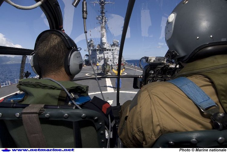 Appontage d'une Alouette III sous les ordres du chien jaune à bord du porte hélicoptères Jeanne d'Arc ( janvier 2008 photo MP Le Ny)