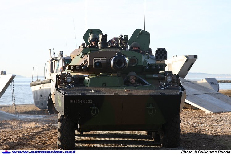 Un blindé AMX 10 RC rénové débarque, pendant l'opération "