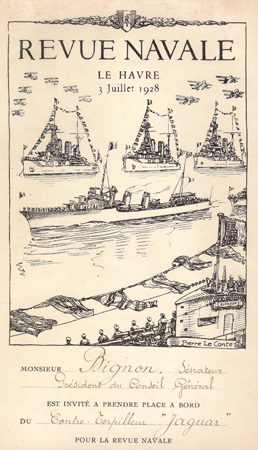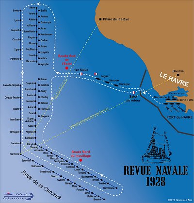 Le 3 juillet 1928, monsieur Gaston Doumergue, le président de la République, passe en revue au Havre les forces navale qui y sont concentrées : 76 bâtiments de guerre sont mouillés sur rade ! Venant de Brest, l'escadre française arrive sur rade le 30 juin vers 6h00. Voici le récit du correspondant du quotidien « Le Petit Havre » [1] pour relater l'évènement : «