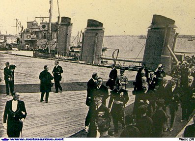 des navires dans le port : « La foule est venue en nombre voir arriver l’escadre dans le port. Les commerces de la rue de Paris sont tous ornés de devantures de fête. A 10h00 le commandant Nivet se rend à l’escadre et vient saluer l’amiral Docteur. Il est rejoint peu après par les personnalités havraises suivantes : Monsieur Lalmand, sous préfet ; Monsieur Hermann du Pasquier président de la chambre de commerce; Monsieur Lang adjoint au maire ; le commandant Cloarec, commissaire général ; Monsieur Haffner président de la Ligue Maritime ; Monsieur Corbeaux, directeur du port autonome ; et Monsieur Le Tier, commandant du port. »