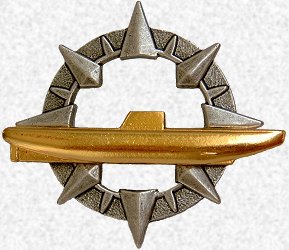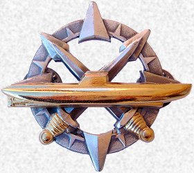 • un insigne comportant une rose des vents argentée, un sous-marin en métal doré, deux glaives entrecroisés à lame argentée et poignée dorée réservé aux commandant et anciens commandants de sous-marins. Cet insigne particulier reçoit du commandant des forces sous-marines et de la force océanique stratégique un numéro pris dans une série continue.